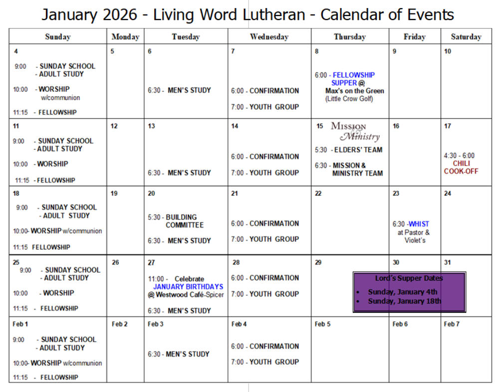 Above is the current calendar of events for Living Word Lutheran. You may also