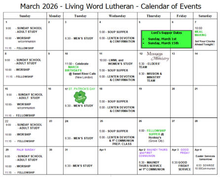 Living Word Lutheran Church Calendar of Events