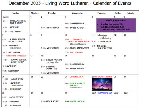 Click on Calendar for larger view...Living Word Lutheran Church Calendar of EventsAbove is the current calendar of events for Living Word Lutheran. You may also download past calendars by clicking below...